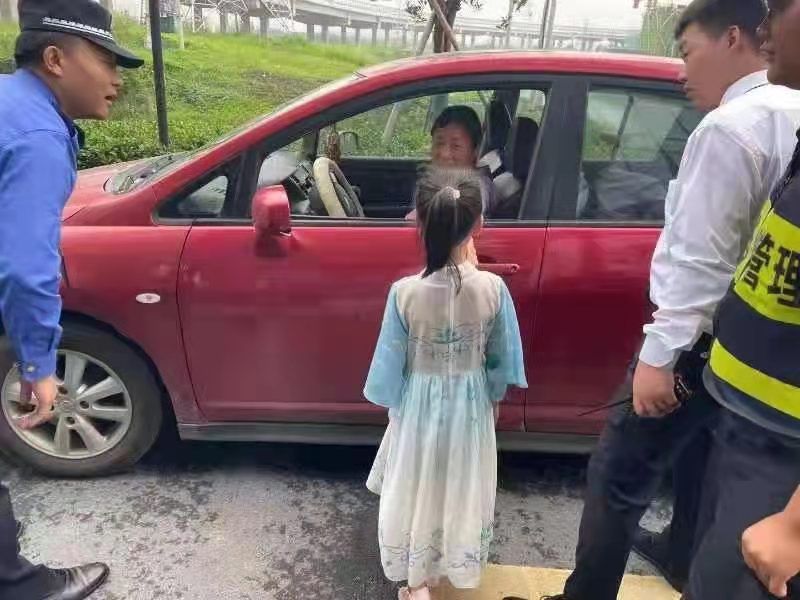 小女孩到學(xué)校后,發(fā)現學(xué)校當天不上課,就趕緊跑出來(lái)找媽媽?zhuān)珛寢屢呀?jīng)開(kāi)車(chē)走了。于是,小女孩便找到在崗位上值勤的余志凱。