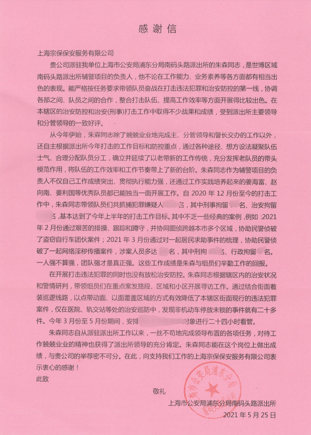 5月25日,宗保公司駐南碼頭路派出所輔警項目收到南碼頭路派出所送來(lái)的一封感謝信,信中稱(chēng)贊項目負責人朱森認真負責的工作態(tài)度和兢兢業(yè)業(yè)的工作精神。