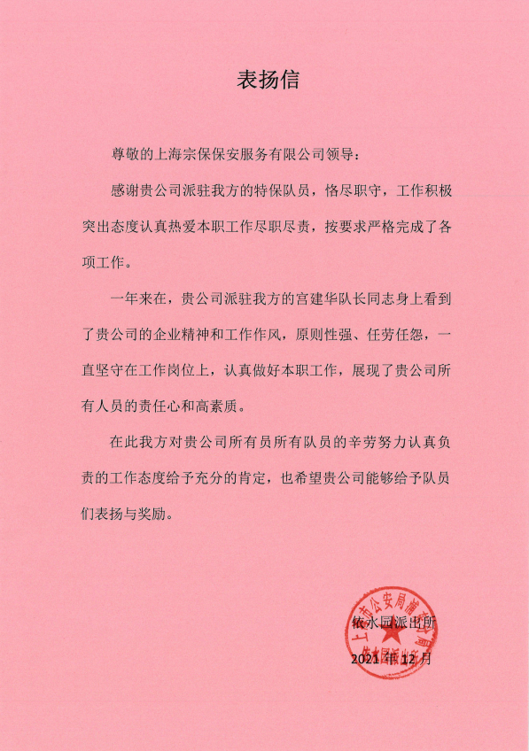 12月24日,宗保公司駐崇明堡鎮項目收到堡鎮城管中隊的表?yè)P信,信中對宗保隊員朱新建盡心履責的工作表現提出特別表?yè)P。