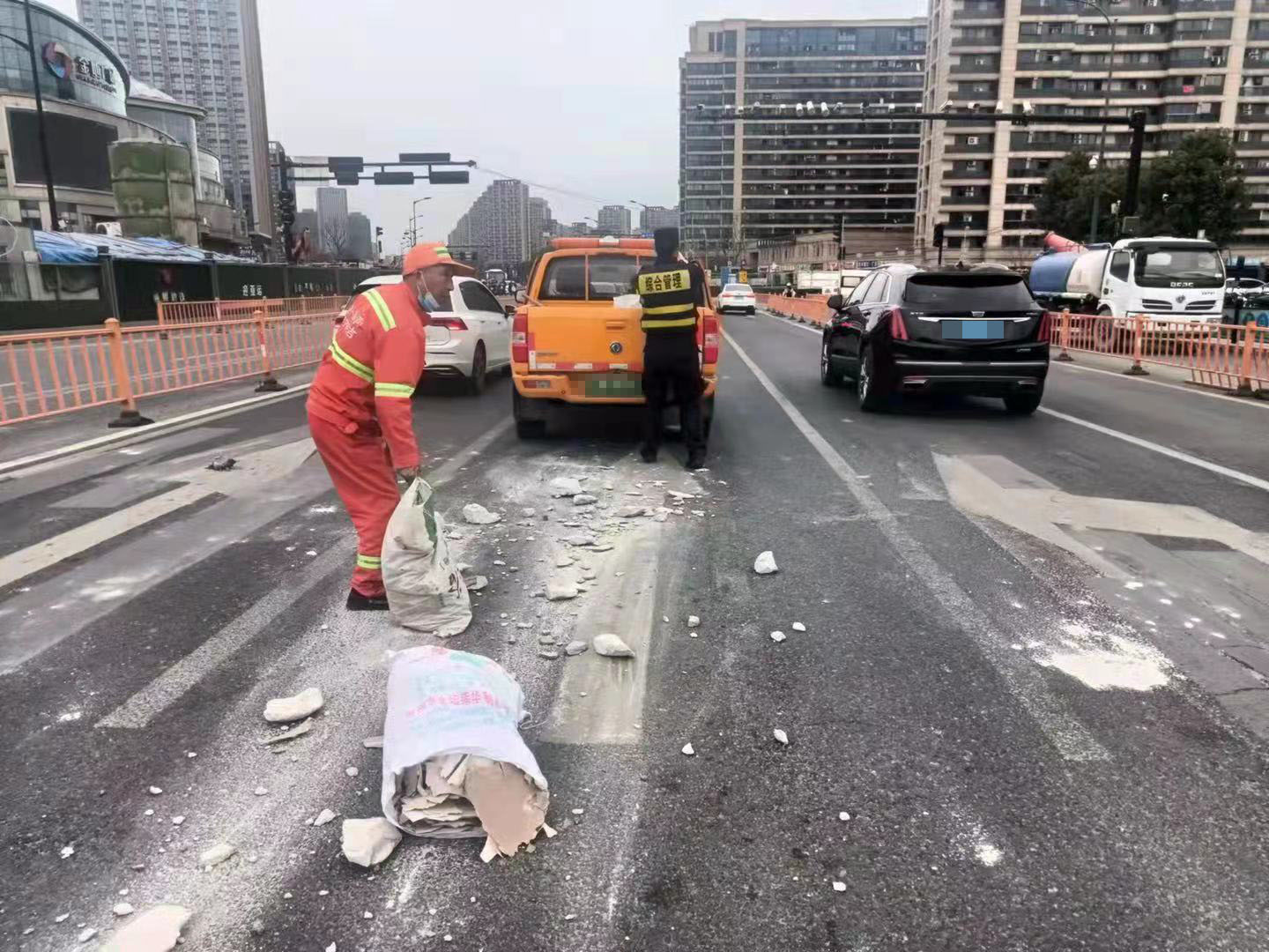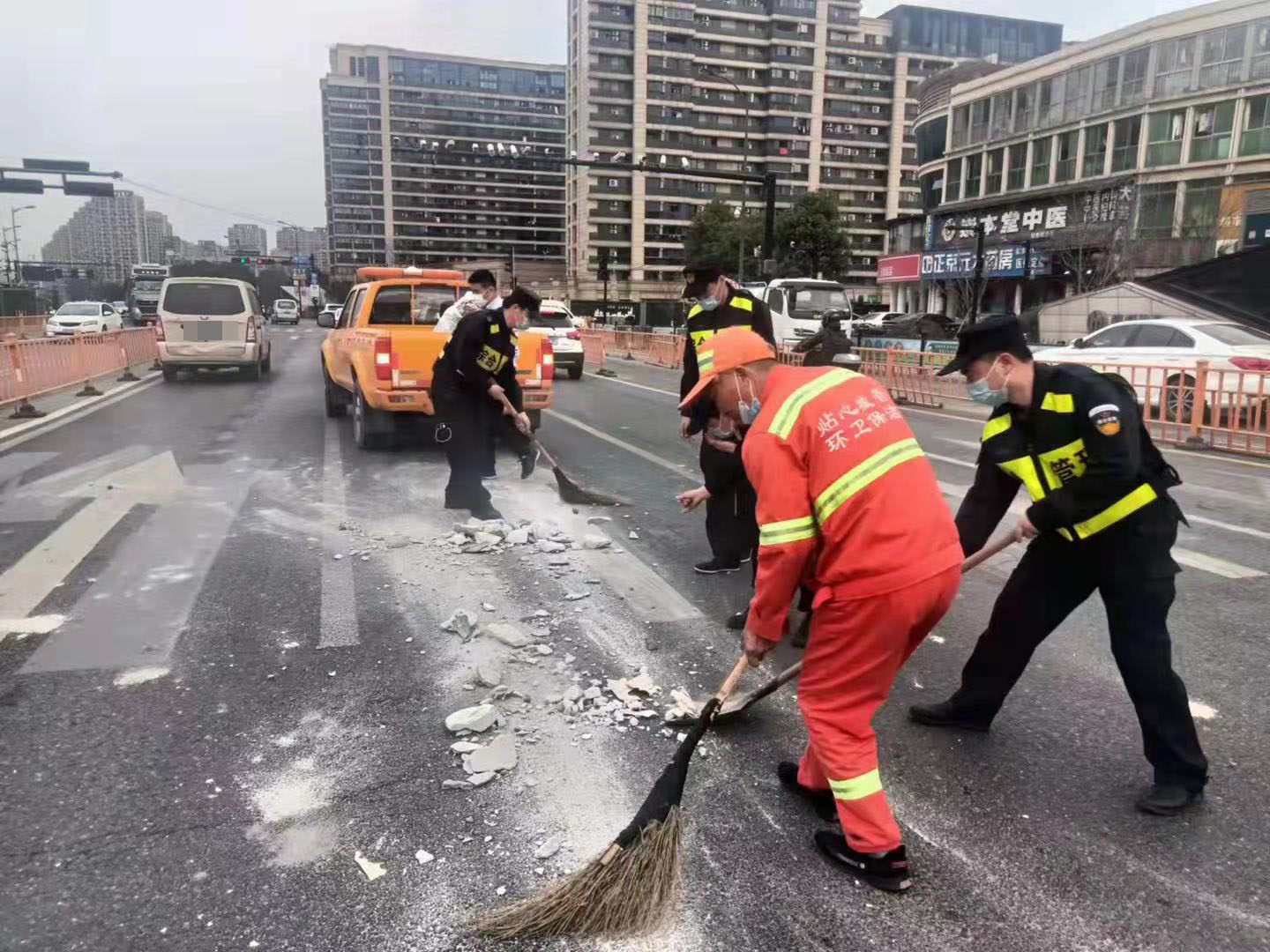 當日,楊培發(fā)、王正、張思俊、黃加武、張亞飛在金家渡地鐵站C出入口巡查時(shí),看見(jiàn)馬路中間有一堆路過(guò)車(chē)輛掉落的建筑垃圾,過(guò)往車(chē)輛紛紛避讓?zhuān)嬖谥?zhù)極大的安全隱患。