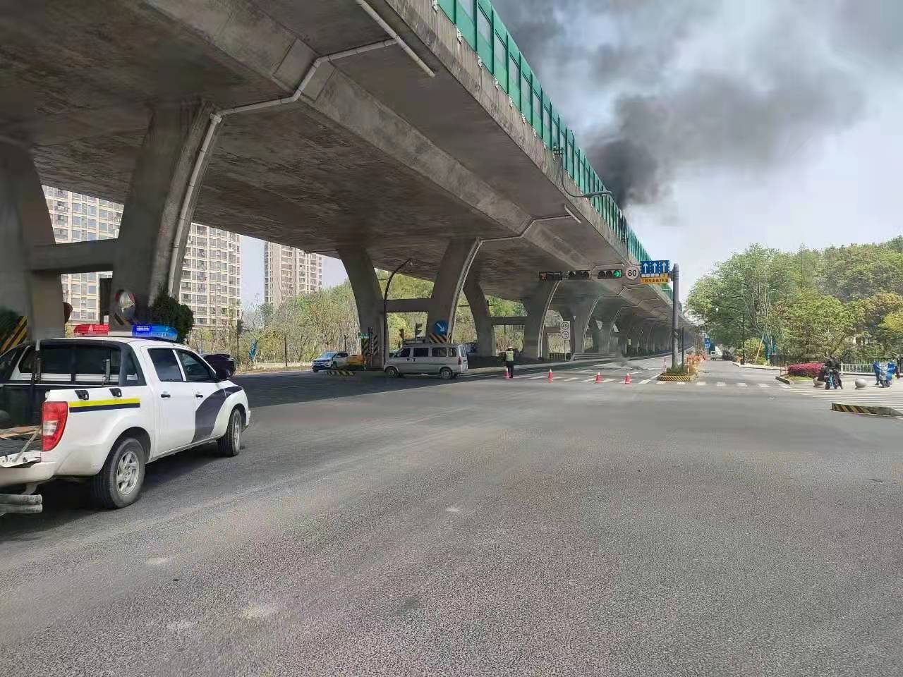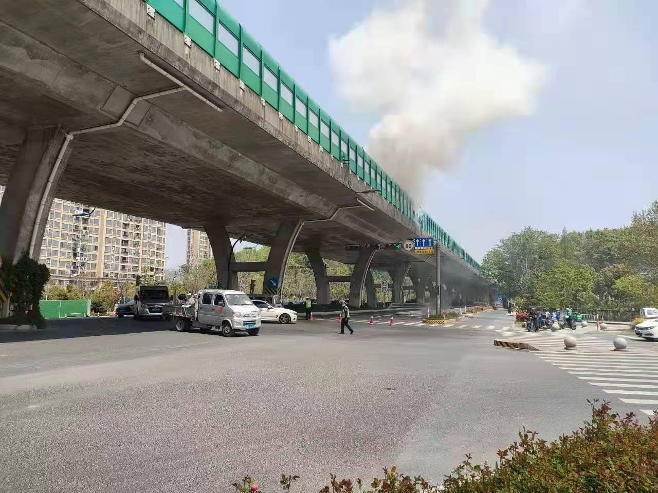 當幾個(gè)人趕到高架橋下時(shí),發(fā)現高速隔離板處有明火在燃燒,玻璃碎渣不時(shí)掉落下來(lái),橋下情況十分危險。見(jiàn)此情形,馮奧立即將情況上報工作站值班領(lǐng)導,協(xié)助引導路面車(chē)輛避開(kāi)繞行,安排同事封閉右轉專(zhuān)用車(chē)道,避免過(guò)往車(chē)輛和行人受到傷害。