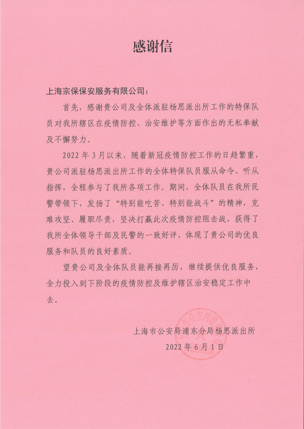6月1日,宗保公司收到浦東公安分局楊思派出所的感謝信,信中對宗保公司全力支持和配合派出所開(kāi)展疫情防控、維護轄區治安表示感謝。