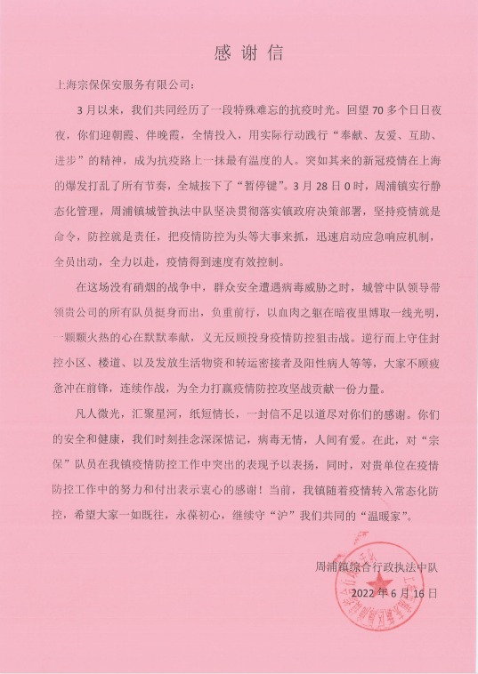 6月16日,宗保公司收到周浦鎮綜合行政執法中隊的感謝信,信中衷心感謝宗保公司在疫情防控工作中的不懈努力和辛勤付出。