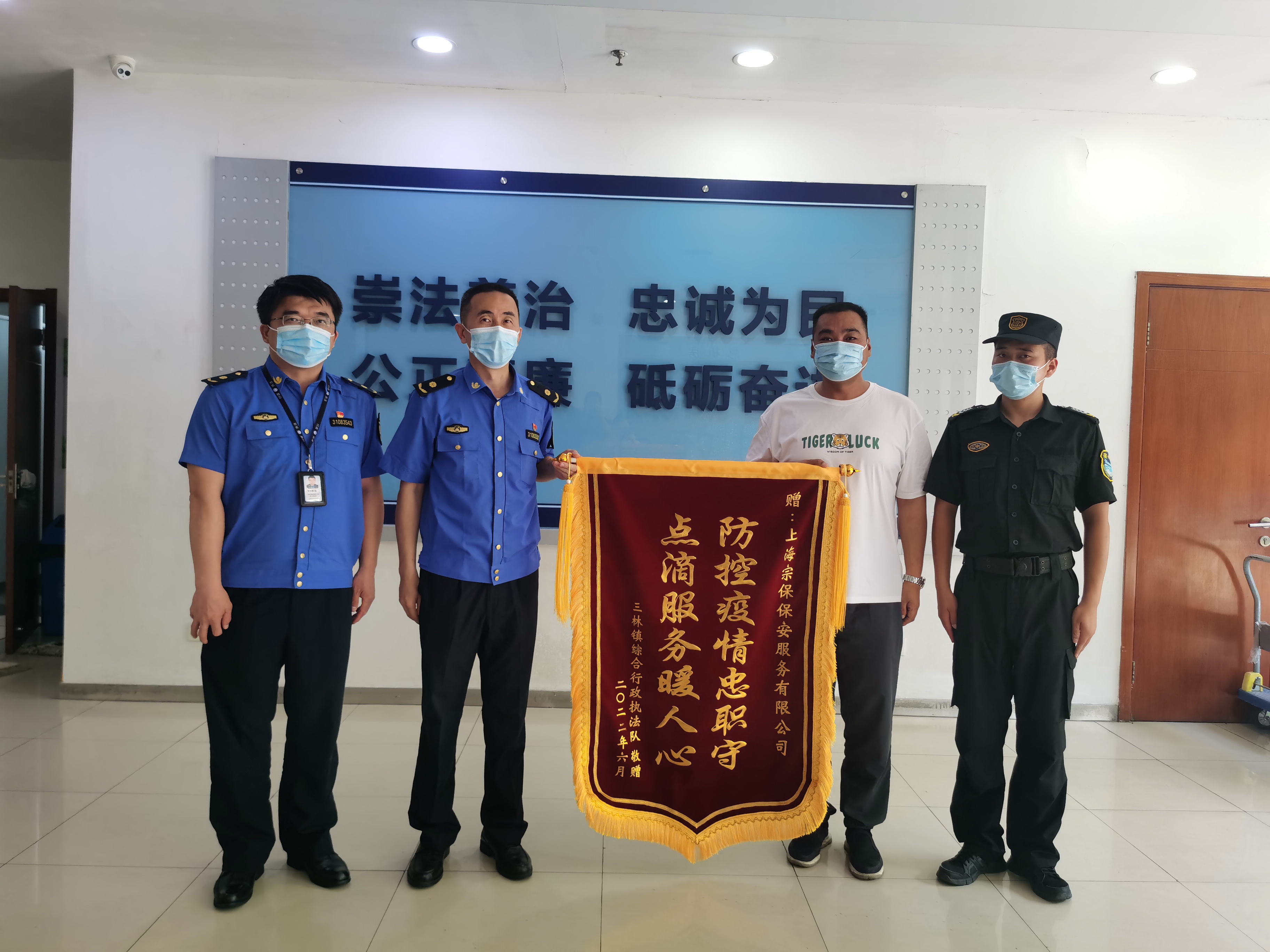 7月5日,浦東三林城管中隊送來(lái)一面繡有“防控疫情忠職守 點(diǎn)滴服務(wù)暖人心”的錦旗和一封感謝信,充分肯定宗保公司員工在疫情防控期間所做的工作,衷心感謝公司員工的辛勤付出。