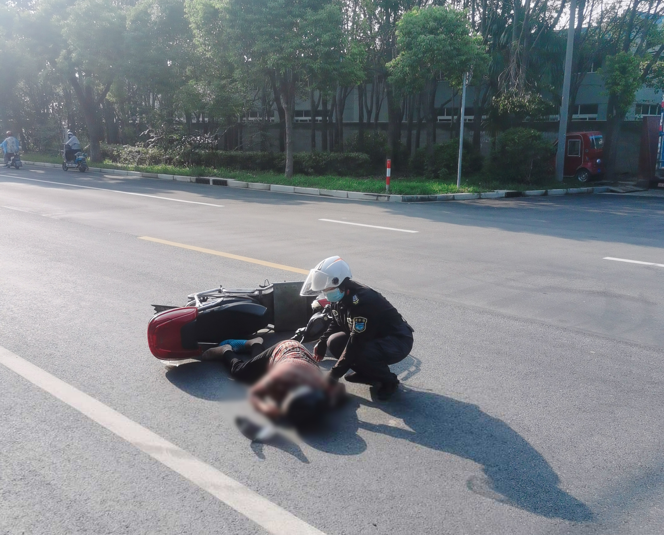 當日16:01,龍鳳嬌在科工路附近巡邏時(shí),看到一位老人躺在馬路中間,一輛電瓶車(chē)倒在一旁,就趕緊上前察看。