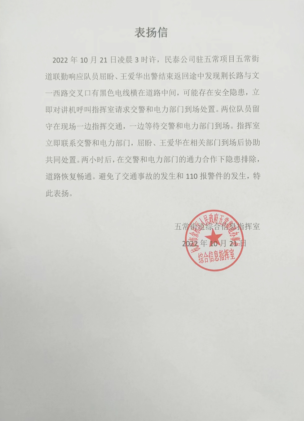 屈盼立刻將情況報告了項目隊長(cháng),并按指示在原地做出警示,保障道路車(chē)輛行人安全,王愛(ài)華則趕緊撥打了報警和電力部門(mén)的電話(huà)。隨后,兩人便對道路進(jìn)行警戒,以免有車(chē)輛和行人誤入。
