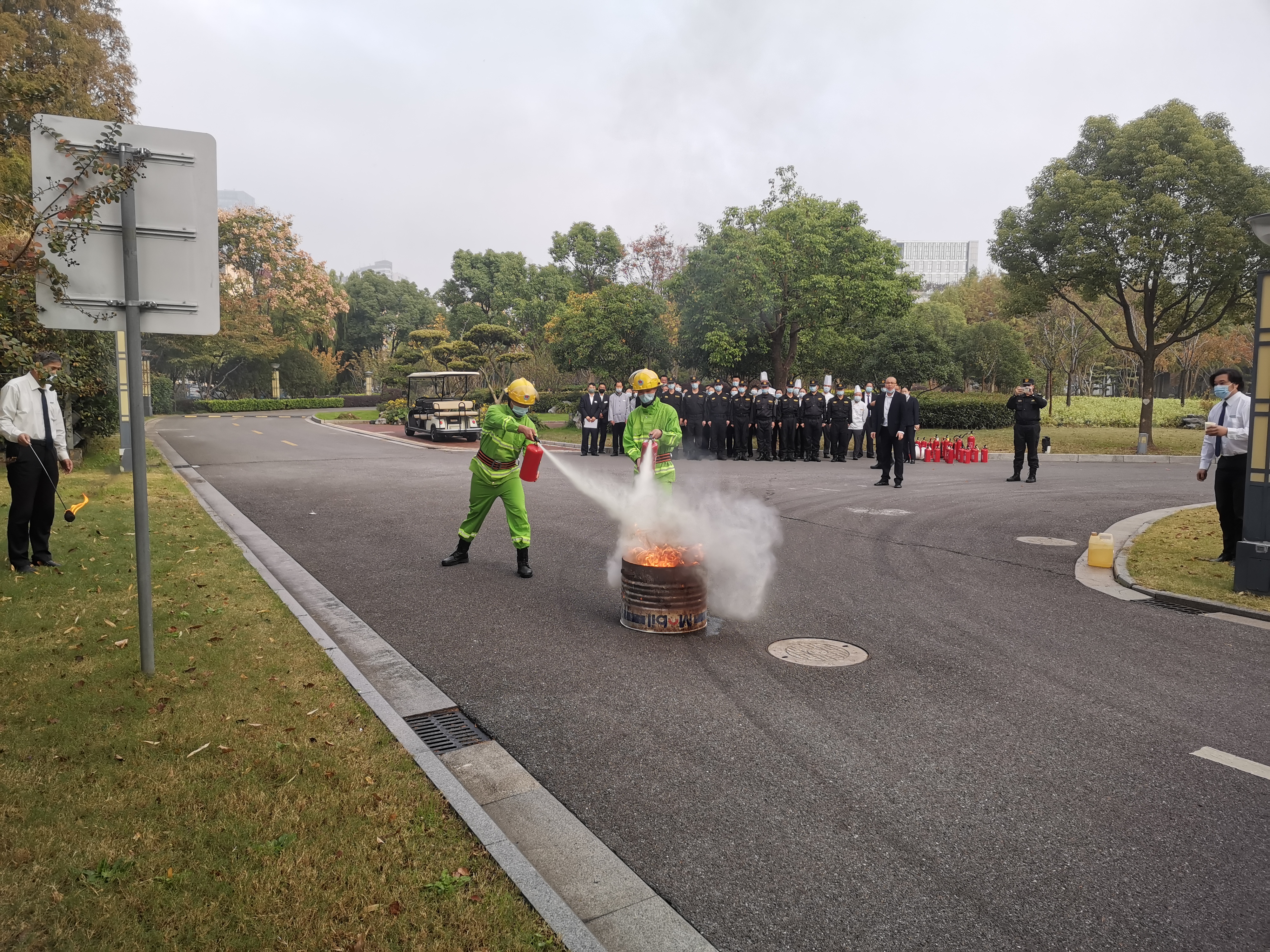 公司項目隊長(cháng)許志剛按照培訓教程,詳細講解了手持式滅火器和消防水帶的使用方法,講授了突發(fā)事件處置和疏散逃生的知識,現場(chǎng)演示了滅火器材的操作使用。隨后,組織進(jìn)行了滅火器實(shí)操演練,火情下人員有序疏散、協(xié)助傷者逃生等實(shí)戰演練。