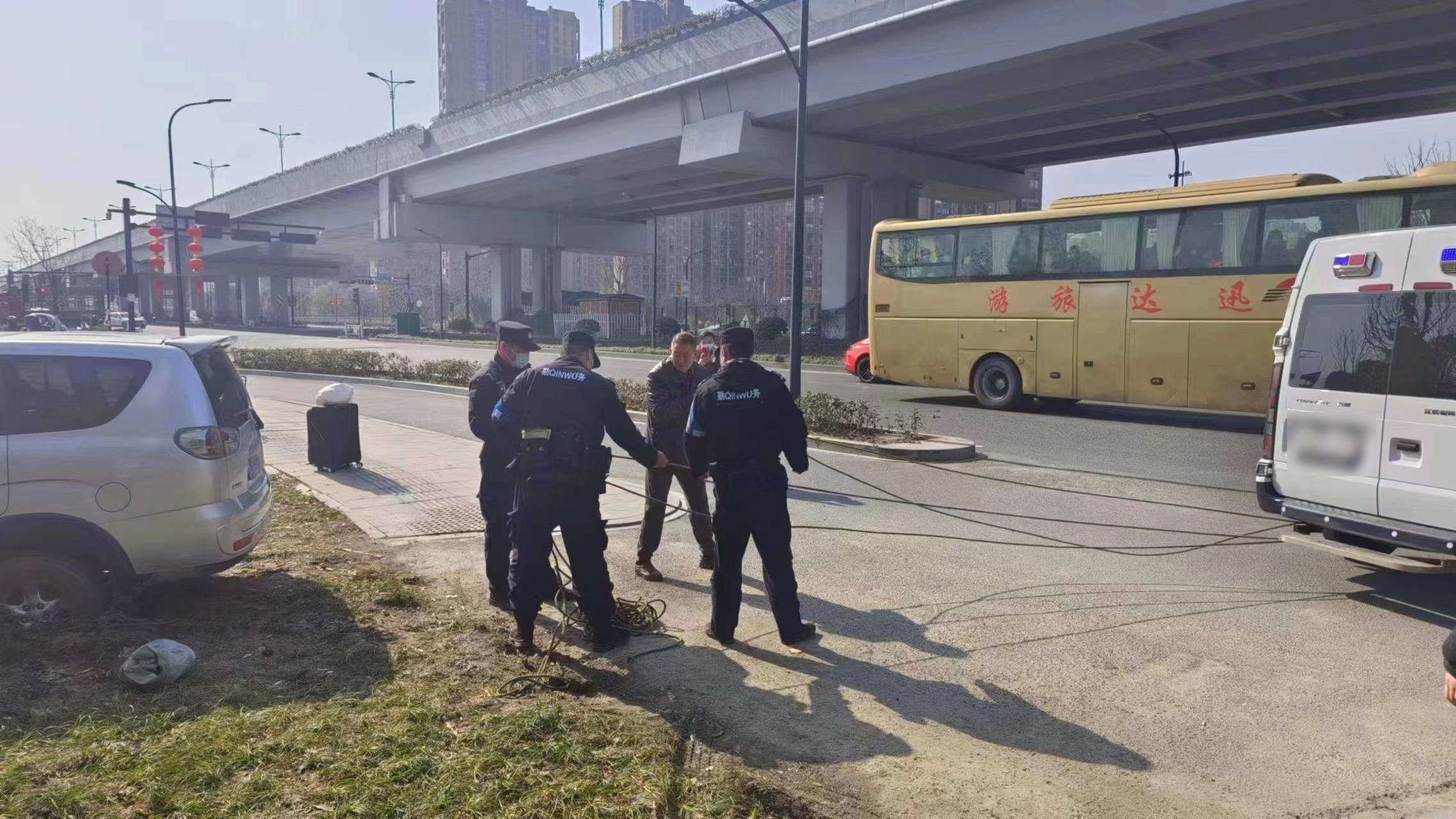 了解情況后,幾人先讓于師傅將車(chē)上的行李和年貨卸下來(lái)減輕車(chē)子負重,隨后眾人合力推車(chē),但因車(chē)子陷入泥中太深,只在原地打滑。這時(shí),劉振疆急中生智,急忙向附近駛來(lái)的貨車(chē)招手求助,借來(lái)拖車(chē)繩,車(chē)尾巡邏警車(chē)拉,車(chē)頭眾人合力推,終于將車(chē)子拖到了馬路上。