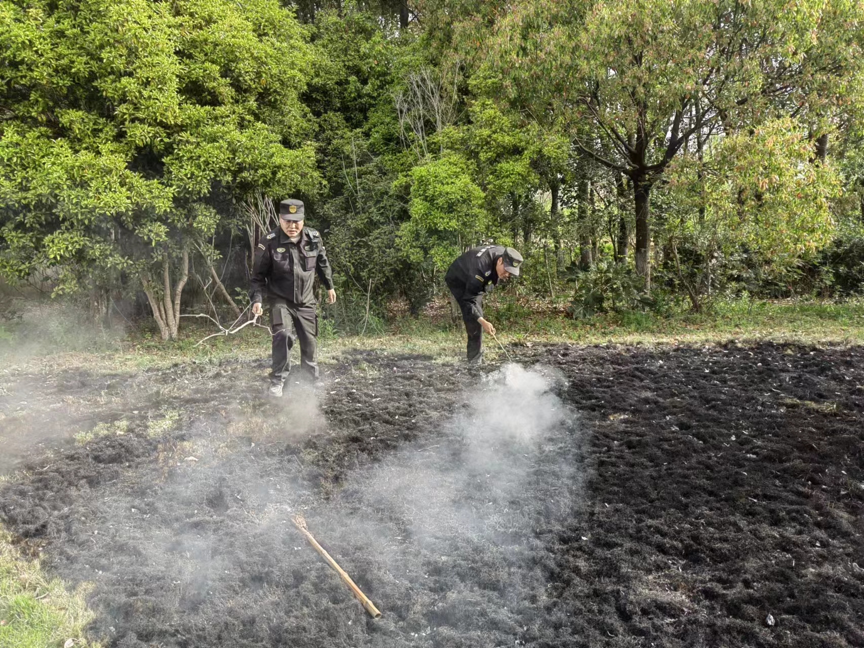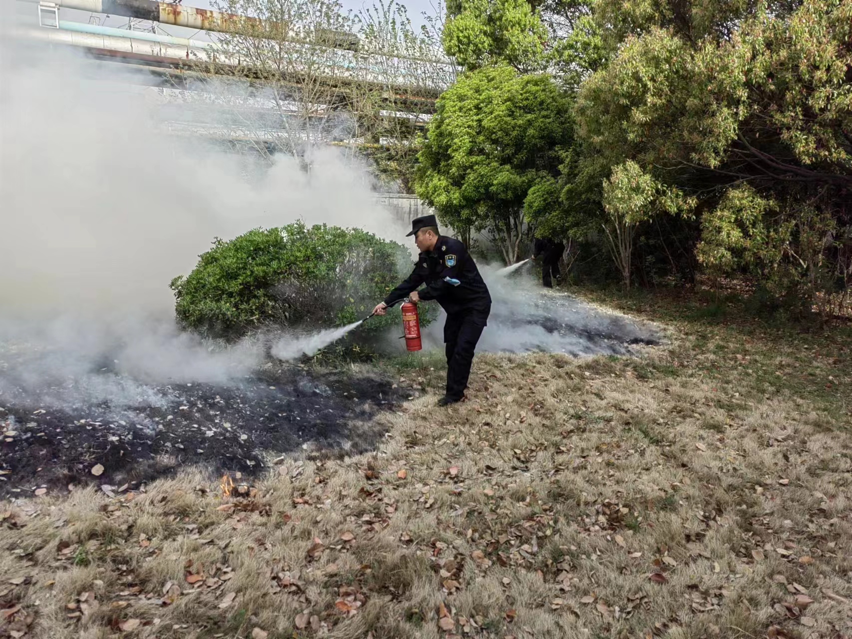3人急忙奔到門(mén)崗室拿起滅火器趕往現場(chǎng),此時(shí)草坪正在燃燒,且火借風(fēng)勢逐漸擴大。3人迅速拉開(kāi)滅火器,趕緊對準著(zhù)火位置滅火,由于撲滅及時(shí),避免了火情大范圍蔓延,最大限度地降低了植被損失。