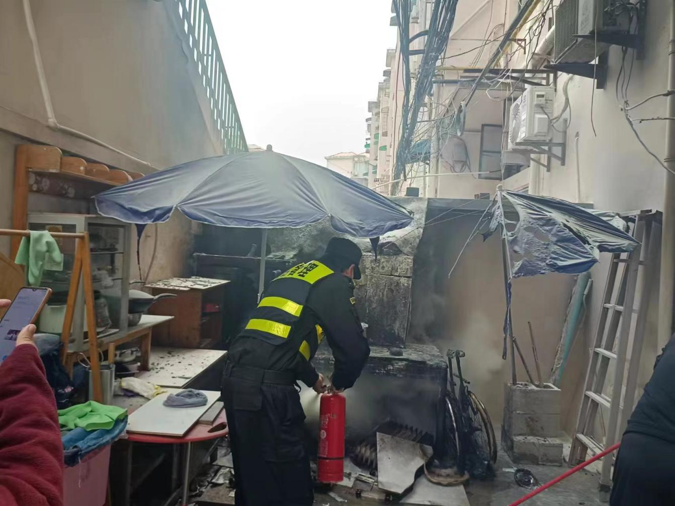 原來(lái)是小區樓道里堆放的雜物著(zhù)火了,熊統超急忙將火情報告當班組長(cháng)和物業(yè)崗亭值班人員,并趕緊奔向物業(yè)門(mén)崗拿起兩個(gè)滅火器進(jìn)行撲救,有效地控制住了火勢蔓延,消除了安全隱患。
