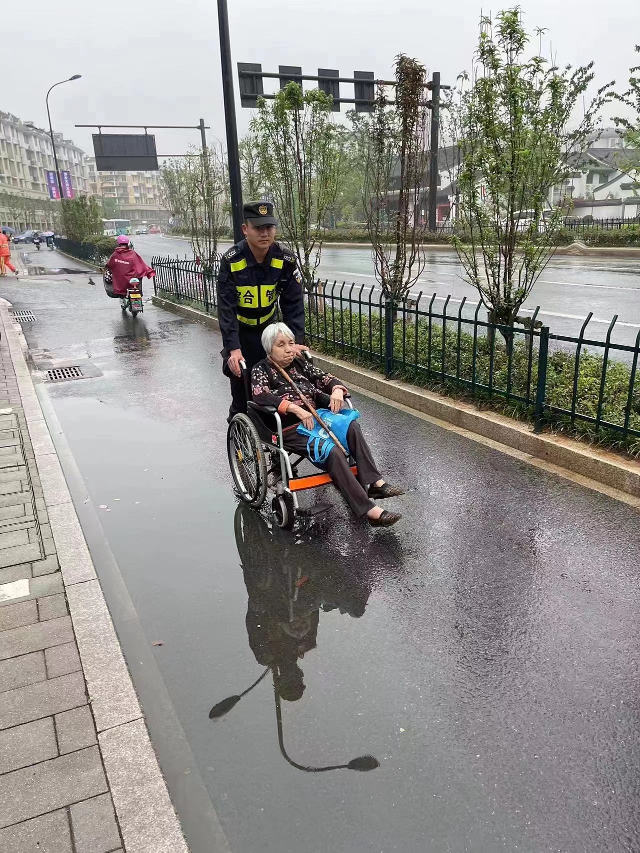 當日7:50,公司員工李學(xué)江、姚迎寒和周銀浩在閑林街道文衛路農貿市場(chǎng)值勤時(shí),遇到一位老人求助,稱(chēng)自己一早來(lái)菜場(chǎng)買(mǎi)菜,坐著(zhù)輪椅走的時(shí)間太長(cháng)了,左腿還患有嚴重的風(fēng)濕病,現在走不動(dòng)回不了家了。