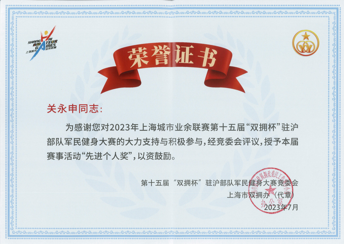 中國人民解放軍建軍96周年之際,為進(jìn)一步踐行習總書(shū)記關(guān)于雙擁工作和體育工作的重要論述,以黨的二十大精神為指導,由市擁軍優(yōu)屬擁政愛(ài)民工作領(lǐng)導小組辦公室、上海警備區政治工作局、市體育局、市擁軍優(yōu)屬基金會(huì )主辦的以“牢記使命礪精兵,健身強軍爭第一”為主題的第十五屆“雙擁杯”駐滬部隊軍民健身大賽,于6月27日至7月9日在軍地各單位駐地陸續展開(kāi),宗保公司作為退役軍人創(chuàng )辦企業(yè)參加大賽。