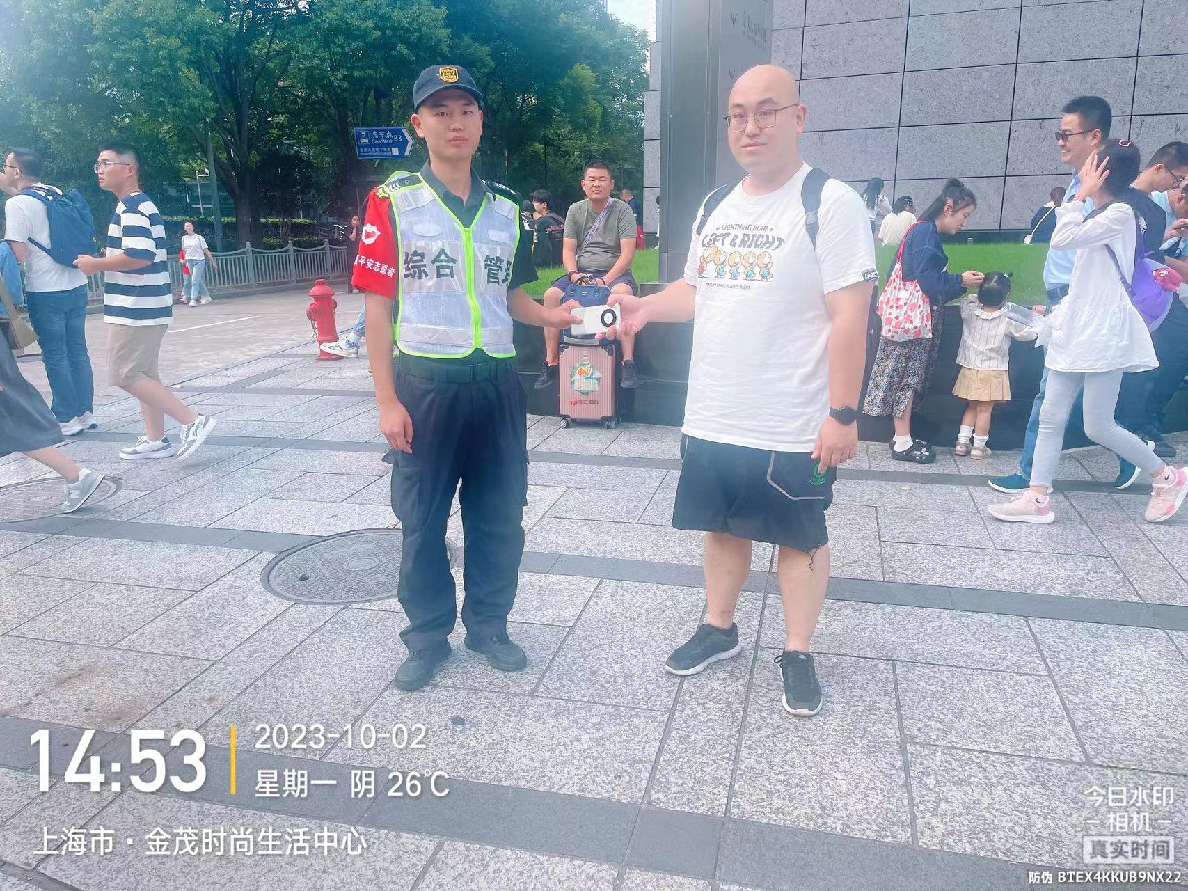 10月2日14:30,宗保公司駐浦東新區三林市容項目員工凌帥龍在陸家嘴金茂大廈附近值勤時(shí),撿到一部華為手機。因手機設有鎖屏密碼,無(wú)法聯(lián)系到失主,凌帥龍便將情況報告了當班組長(cháng),并按指示留在原地等待失主。幾分鐘后,一位男士打來(lái)電話(huà),語(yǔ)氣十分焦急,稱(chēng)自己的手機掉了。凌帥龍初步了解情況后,與他約好碰面的地點(diǎn)。大約過(guò)了20多分鐘,一位身穿白色T恤的男士趕來(lái)認領(lǐng)。凌帥龍核實(shí)確認男士是失主后,就將手機交還給了他。男士拿到手機,再三地向員工凌帥龍表示感謝。