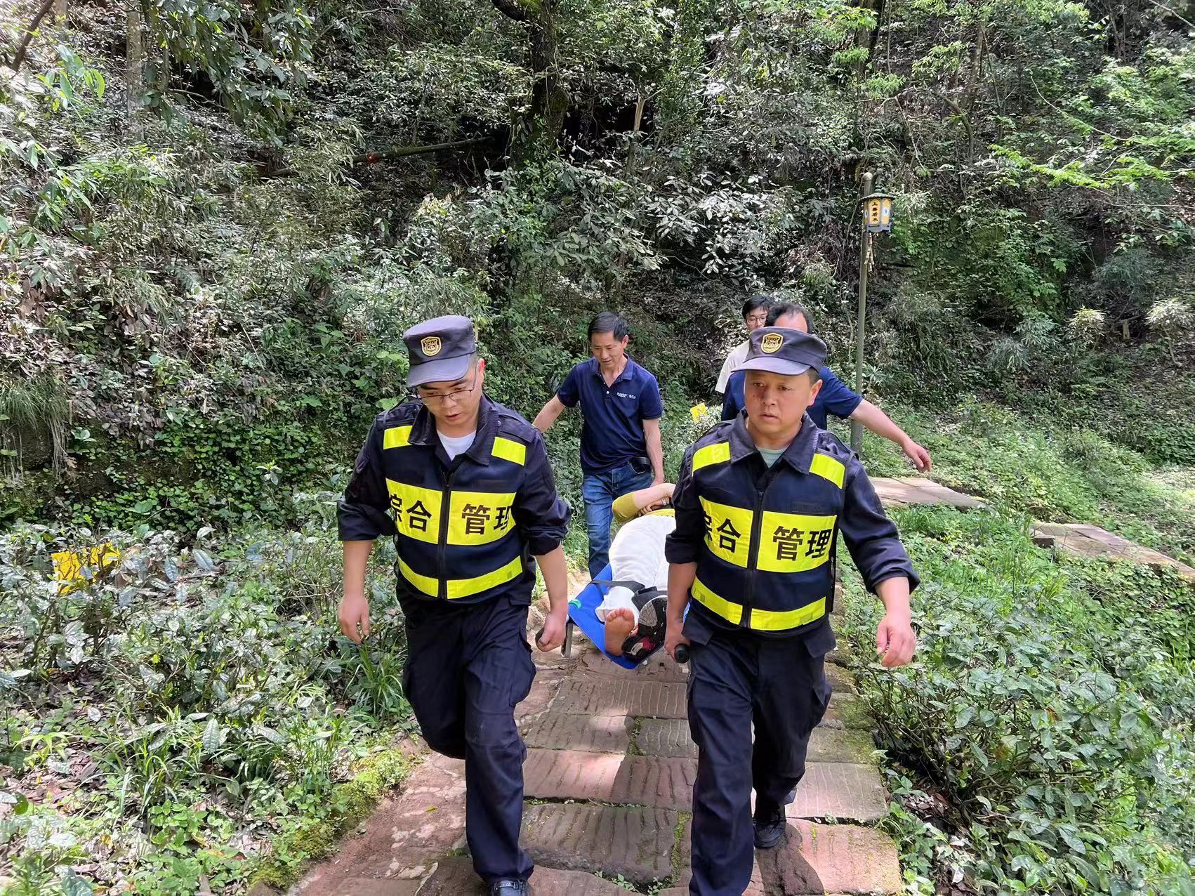 當日12:30 ,公司員工方文才和黃新年在齊云山景區巡查時(shí)接到通知,碧蓮池附近有位女士不慎崴傷腳踝,要求馬上前往現場(chǎng)救援。接到通知后,方文才和黃新年帶上擔架與景區管委會(huì )工作人員一道急忙趕往事發(fā)地。
