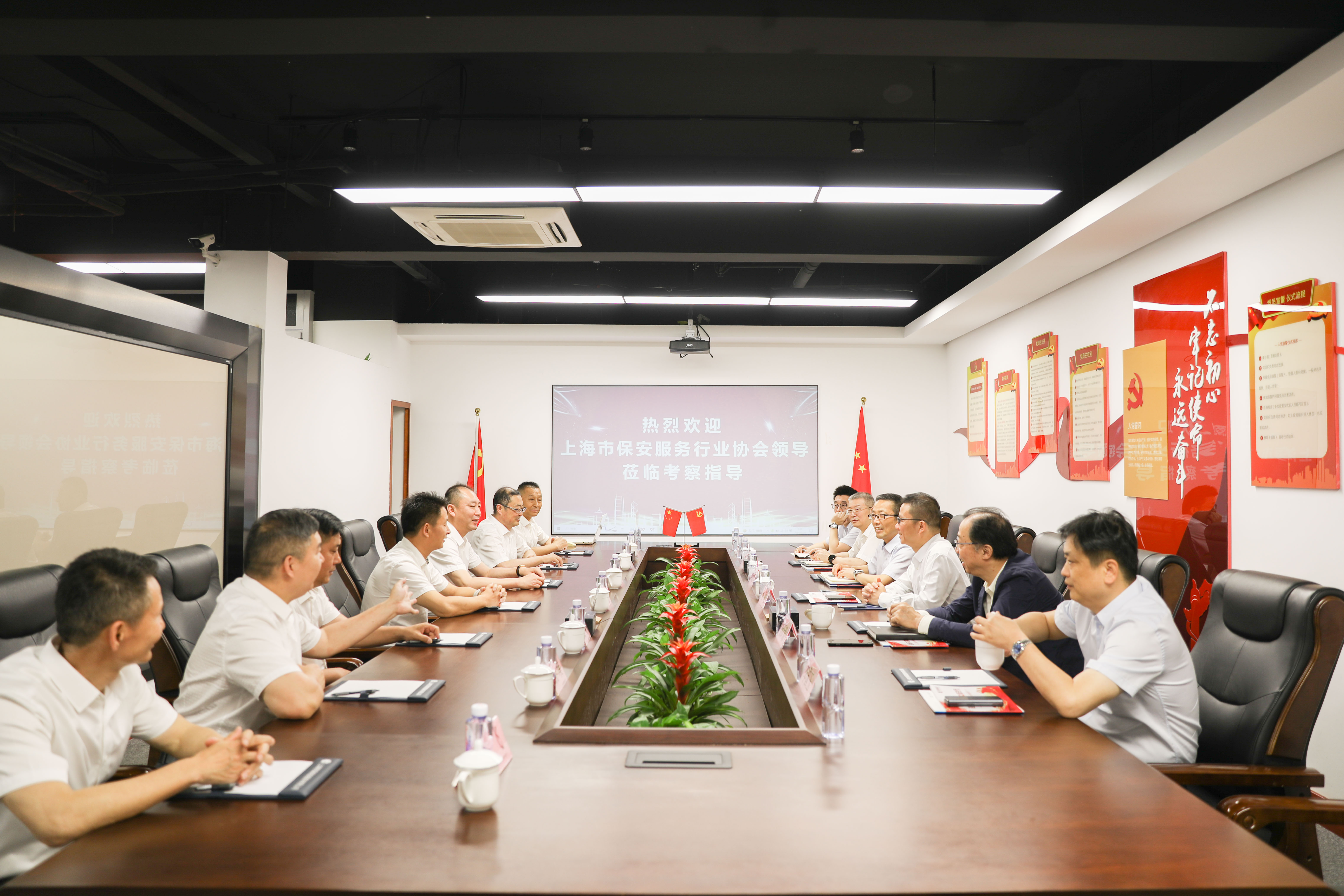 5月28日,上海市保安服務(wù)行業(yè)協(xié)會(huì )會(huì )長(cháng)馬凌和秘書(shū)長(cháng)楊躍毅一行來(lái)到宗保公司走訪(fǎng)調研。上海市保安服務(wù)行業(yè)協(xié)會(huì )辦公室主任李國玉、上海市保安集團黨委副書(shū)記、總經(jīng)理魏繼業(yè)等隨同調研。