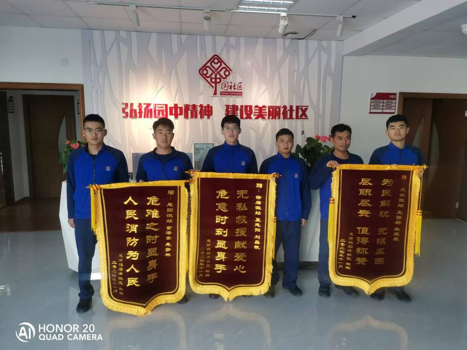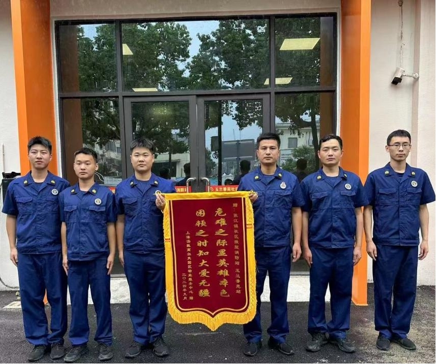 浦東新區張江鎮社區微型消防站、玉蘭香苑站獲贈繡有“危難之際顯英雄本色 困頓之時(shí)知大愛(ài)無(wú)疆”的錦旗
