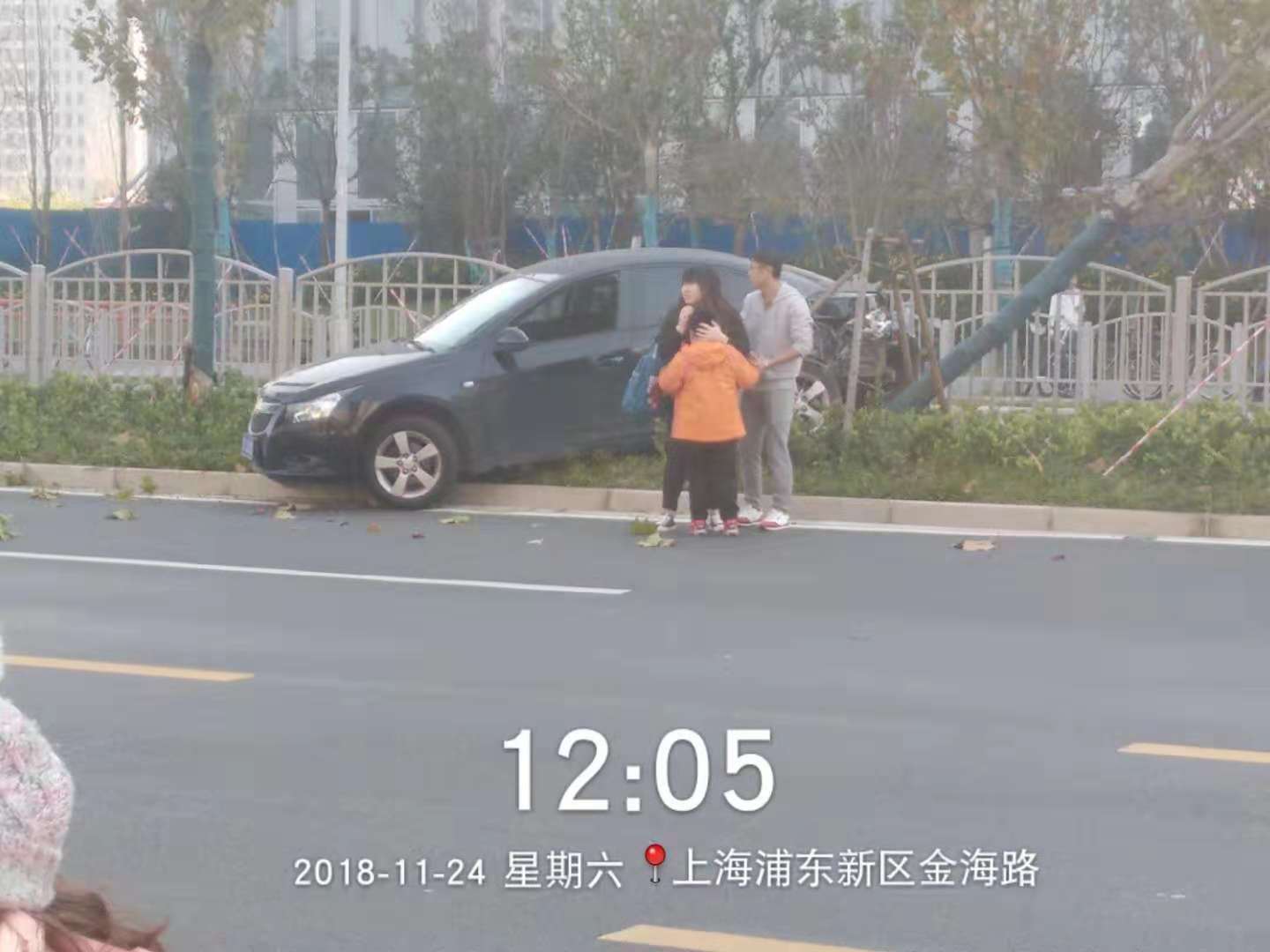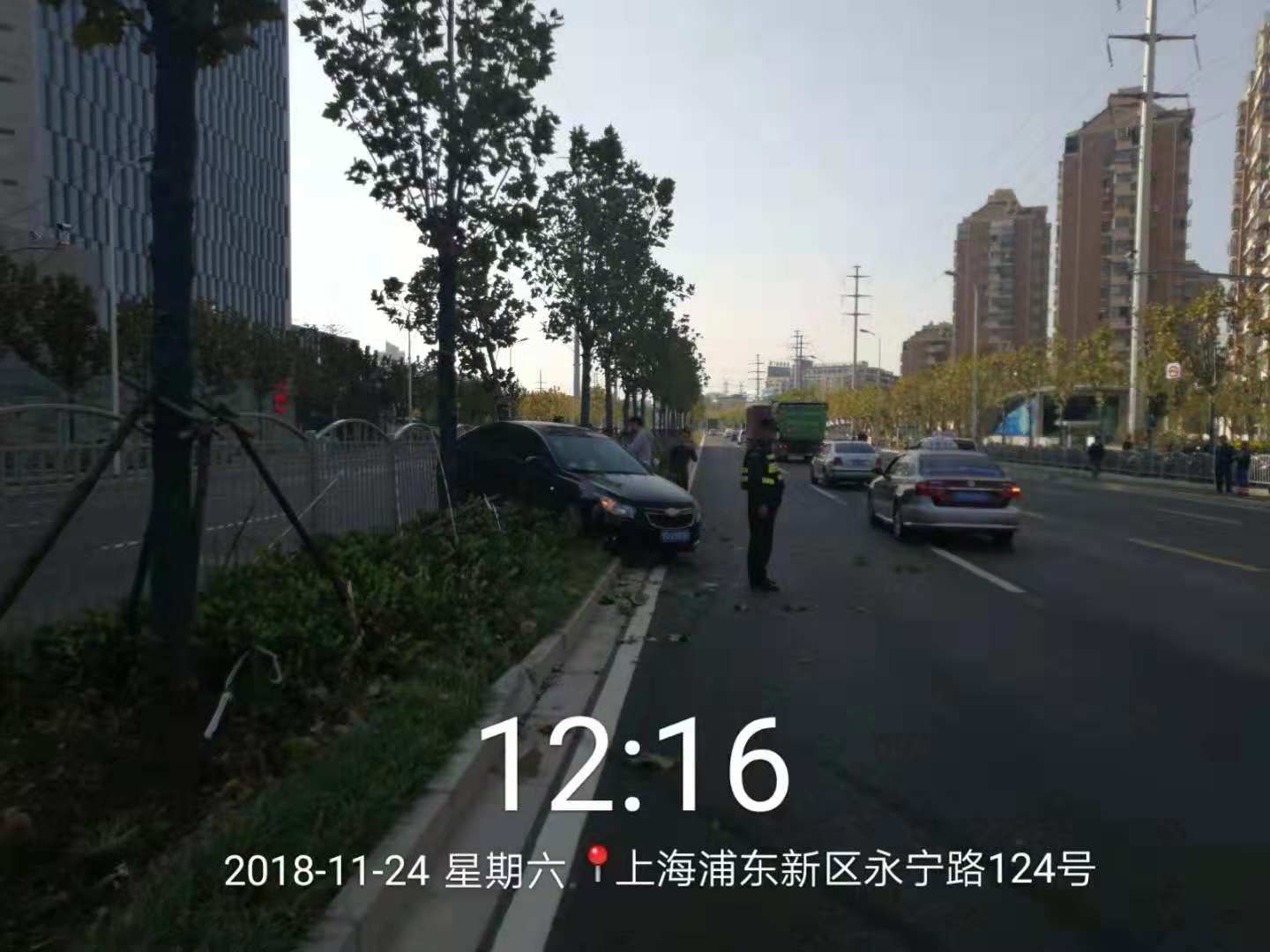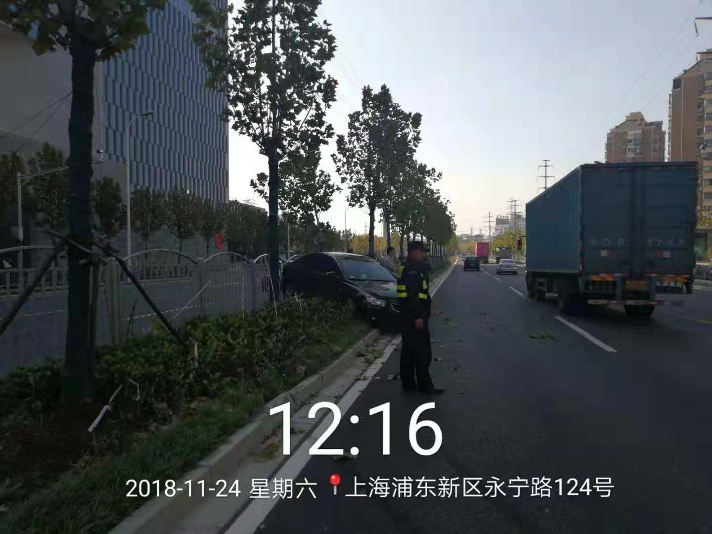 12:00左右,當宗保駐金橋輔警項目巡邏隊員,巡邏經(jīng)過(guò)金橋地鐵站附近時(shí),發(fā)現路上發(fā)生了一起車(chē)禍,因一輛大卡車(chē)強行變道,撞上小轎車(chē)車(chē)尾,導致小轎車(chē)撞向綠化帶,所幸事故中無(wú)人傷亡。隊員許偉立即向帶班組長(cháng)匯報情況,并和隊友及金橋城管巡邏隊員一起參與到交通事故救助中,一起保護現場(chǎng),維持交通秩序,等待交警來(lái)處理。