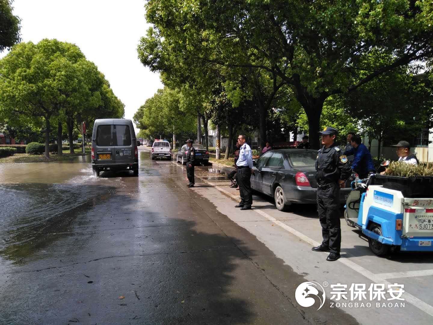 現場(chǎng)由于水管?chē)乐仄屏?,造成路面大量積水,影響過(guò)往車(chē)輛和行人通行。宗保隊員打開(kāi)隨騎電瓶車(chē)警燈現場(chǎng)指揮交通,并對路邊堵塞雨水篦子進(jìn)行疏通,及時(shí)排掉路面積水。