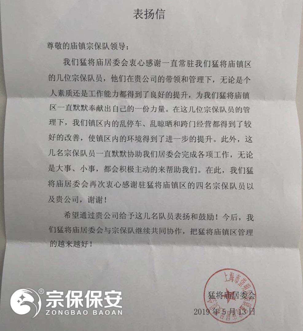 2019年5月20日,崇明廟鎮合作居委會(huì )陳書(shū)記將一封表?yè)P信送到宗保保安駐崇明廟鎮項目,以表示對宗保公司工作的認可及感謝。