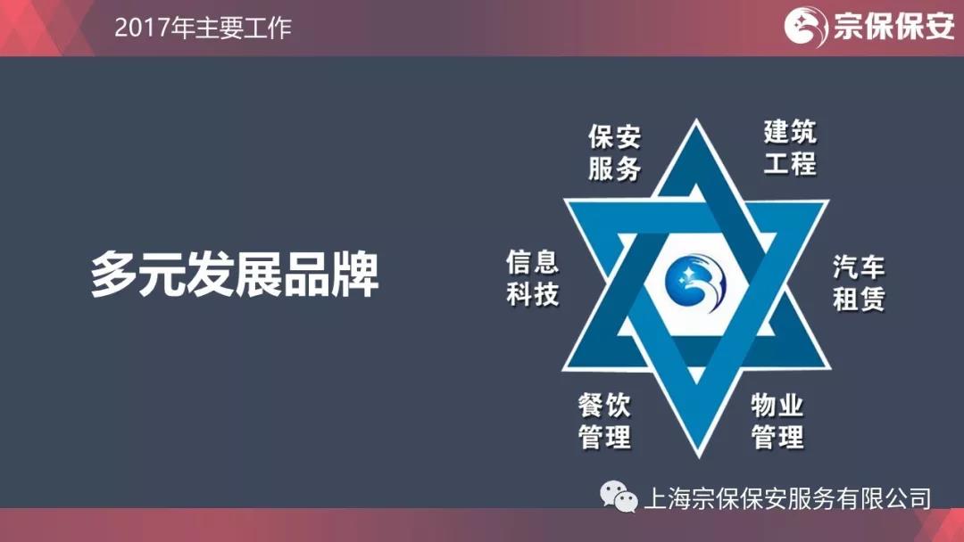 一花獨放不是春,百花齊放春滿(mǎn)園。目前,宗保旗下共有3家保安公司,1家餐飲管理公司,1家物業(yè)管理公司,1家信息科技公司,1家建筑工程公司。宗保品牌多元化發(fā)展道路初見(jiàn)成效。