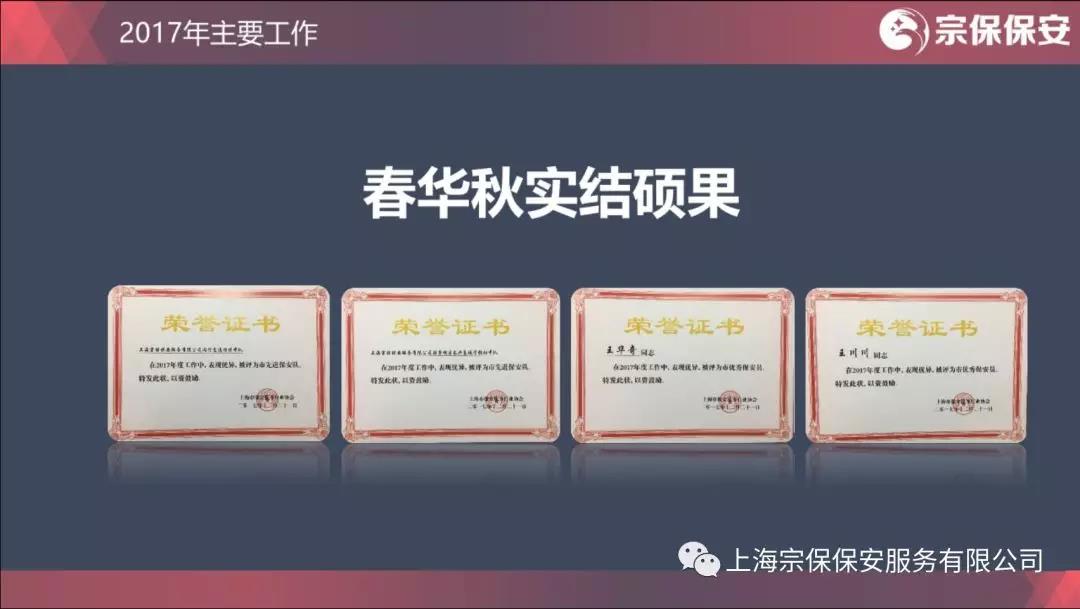 2017年,閔行交通輔警項目、長(cháng)興島城管輔助項目被評為上海市先進(jìn)保安隊,高行城管輔助項目被評為浦東新區先進(jìn)保安隊,王華奇、王川川被評為上海市優(yōu)秀保安員。榮譽(yù)的背后是公司領(lǐng)導精心謀劃、耐心督促、細心檢查,是隊長(cháng)、骨干親力親為、模范帶頭、一以貫之,是隊員們日日夜夜、風(fēng)風(fēng)雨雨、點(diǎn)點(diǎn)滴滴。獎狀和證書(shū),是宗保人青春與汗水的見(jiàn)證。