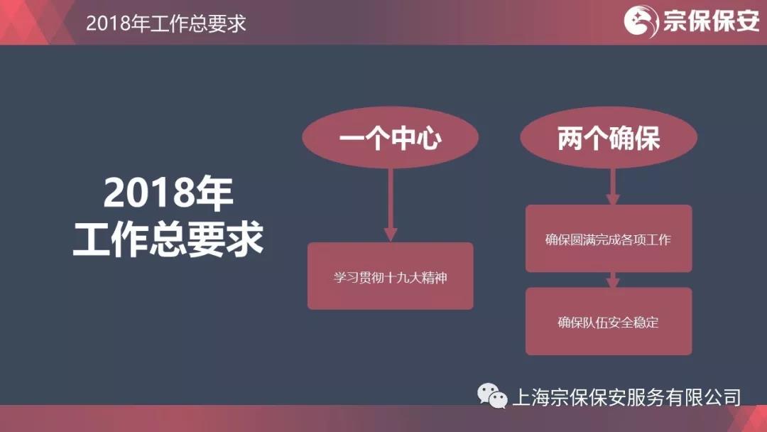 激情和汗水成就過(guò)去,理性和堅強鑄就未來(lái)。2018年,公司總體要求是抓住一個(gè)中心,守住兩個(gè)確保。一個(gè)中心就是學(xué)習貫徹十九大精神。十九大報告指出,要不斷滿(mǎn)足人民日益增長(cháng)的美好生活需要,習近平總書(shū)記在上海提出的“讓城市更有序、更安全、更干凈”,這都對我們的工作提出了新的更高的要求。兩個(gè)確保就是確保圓滿(mǎn)完成甲方交給的各項工作,確保隊伍安全穩定。前者是使命所系、職責所在,沒(méi)有這個(gè)確保,公司和隊員就沒(méi)有存在的價(jià)值和作用;后者是根本保證和依托,沒(méi)有這個(gè)確保,一切工作都是空話(huà),只能是水中月、鏡中花。