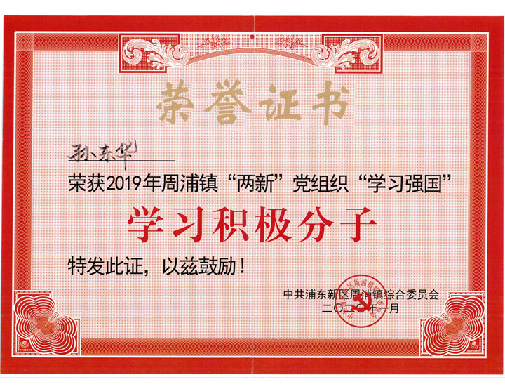 2020年1月3日,浙江民泰公司副總經(jīng)理孫東華被浦東新區周浦鎮評為2019年“兩新”黨組織“學(xué)習強國”學(xué)習積極分子,受到表彰。