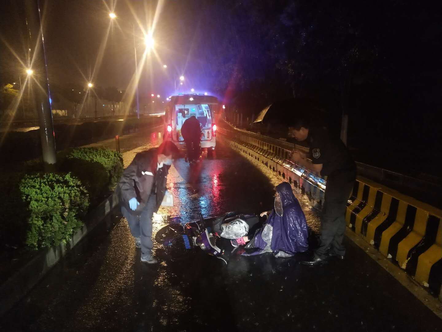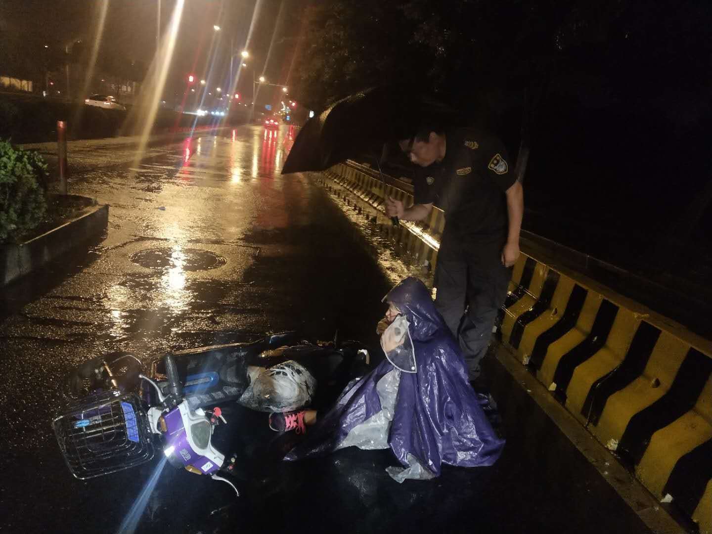 當晚22:30,大雨傾盆,能見(jiàn)度較差。李杰巡邏到申江路周祝公路時(shí),發(fā)現一輛電瓶車(chē)摔倒在地,一名女子躺在雨水中無(wú)法動(dòng)彈。