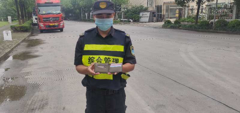 6月24日6:30,宗保公司駐高行市容項目駕駛員崔雷雷巡查至衡安路598號附近時(shí),發(fā)現馬路邊有一黑色錢(qián)包。小崔停好車(chē)撿起錢(qián)包,內裝有少量現金、身份證、銀行卡、各類(lèi)證卡、行程單據等。清點(diǎn)錢(qián)包內物品時(shí),小崔打開(kāi)執法記錄儀進(jìn)行了全程記錄。