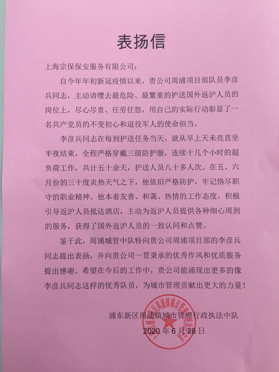 6月28日,宗保公司駐周浦市容項目收到周浦鎮城市管理行政執法中隊送來(lái)的一封表?yè)P信,信中對周浦市容項目隊員李彥兵提出表?yè)P,并對宗保公司提供的優(yōu)質(zhì)服務(wù)和隊員展現的優(yōu)良作風(fēng)表示感謝。