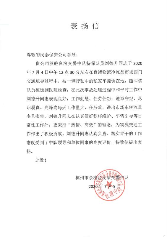 7月27日,浙江民泰保安服務(wù)有限公司收到一封杭州余杭區良渚交警中隊的表?yè)P信,對員工劉德升的工作給予了充分肯定和贊揚。