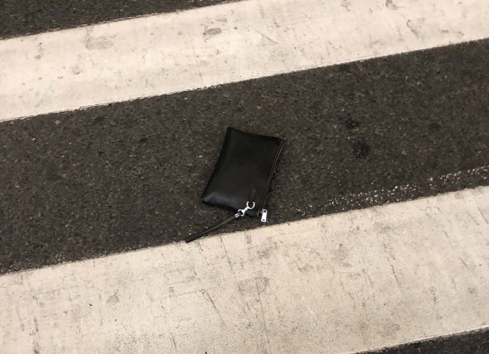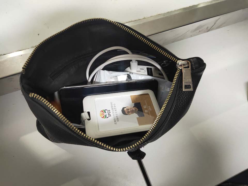 當天19:37,王琦在出發(fā)層25號門(mén)前巡邏時(shí),撿到一個(gè)手提包,便立即上報當班領(lǐng)導。為了尋找失主的聯(lián)系方式,王琦打開(kāi)執法記錄儀錄像取證,經(jīng)清點(diǎn)包內有手機、充電寶、幾張銀行卡等物品。